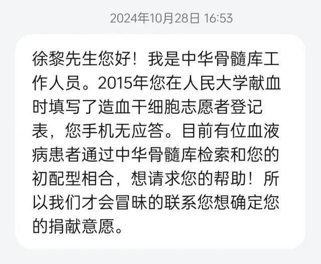 ▲ 徐黎收到中华骨髓库的联络短信2024年10月28日中华骨髓库传来激动人心的消息一位急需造血干细胞移植的白血病患者与徐黎的HLA初配型相合徐黎毫不犹豫地表示愿意成为捐献者然而命运似乎给他设置了一个特别的考验徐黎长期患有胆结石为了能够及时完成这份使命他推迟了手术